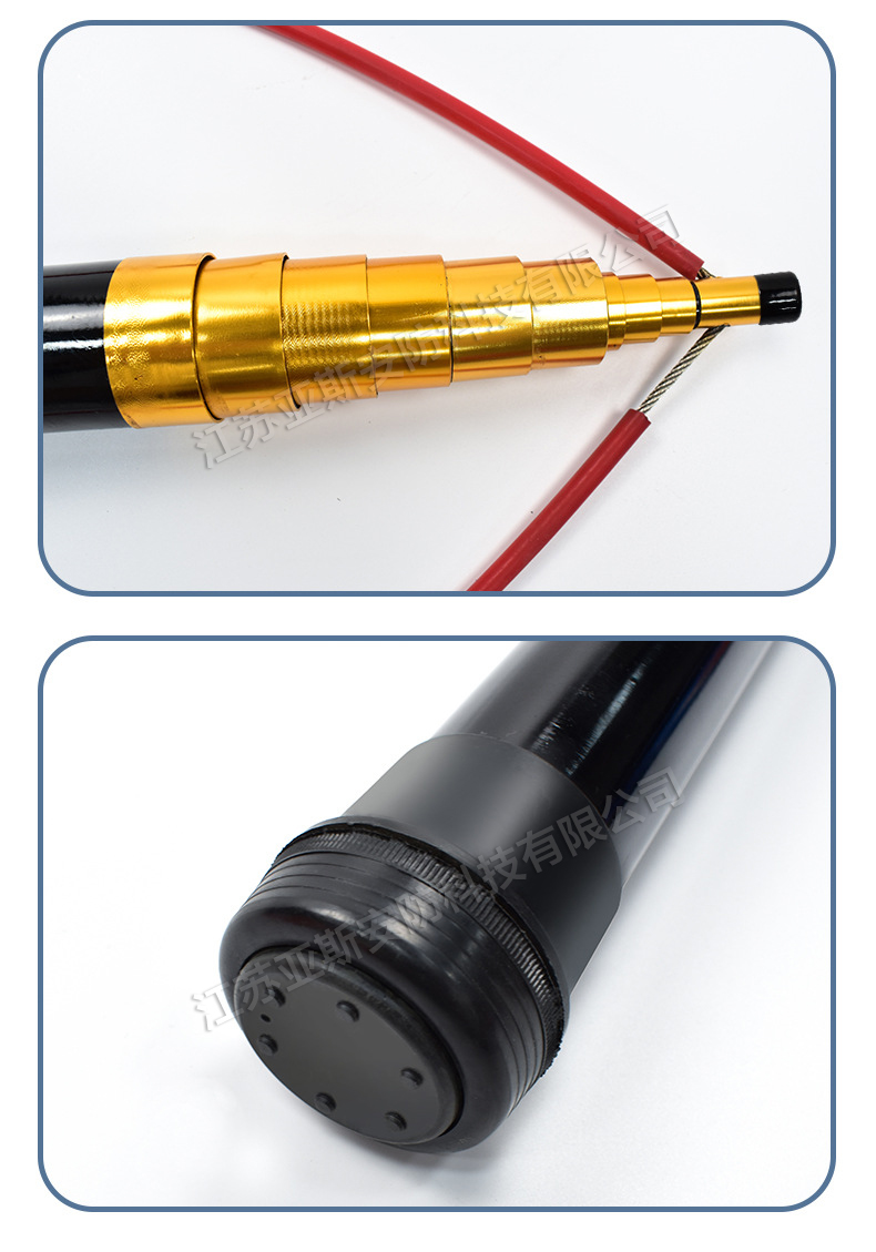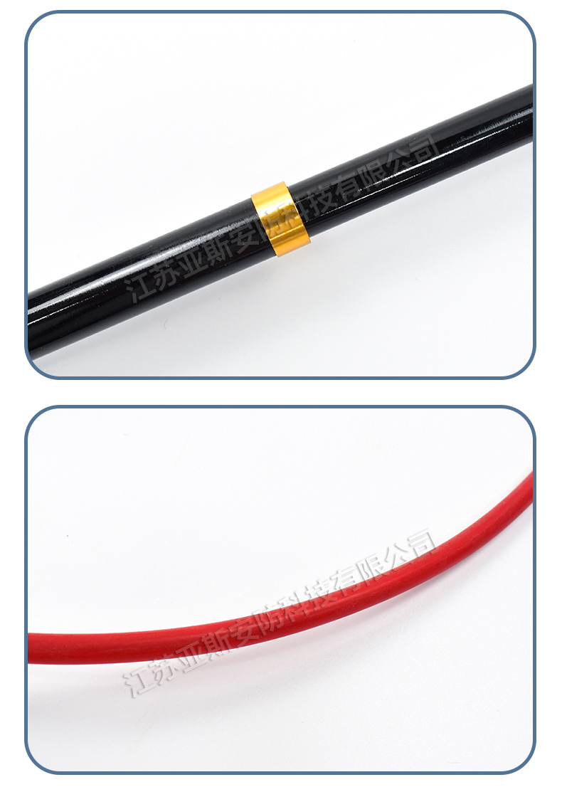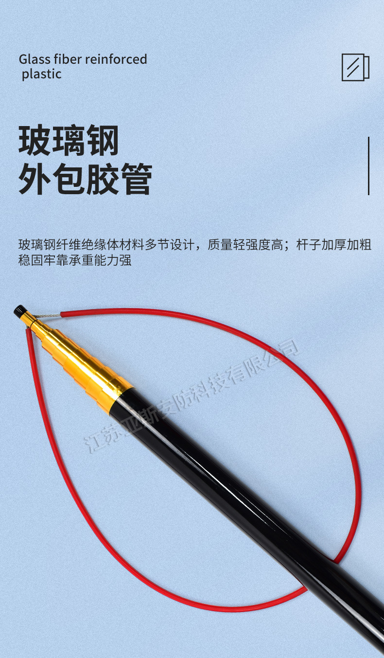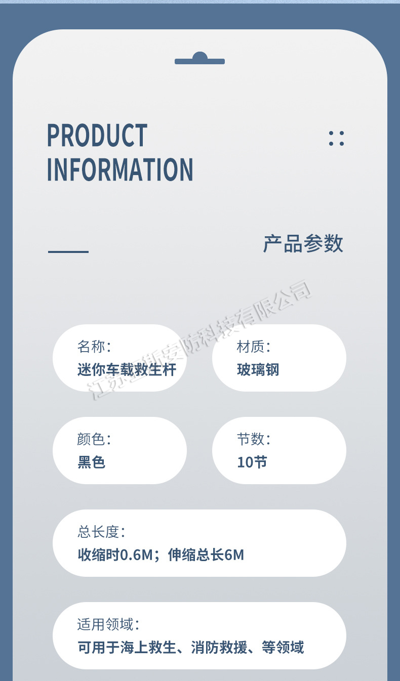 材质:玻璃钢,伸长6米,收缩后0.6米,颜色:黑色,重量:0.9公斤,最粗外径43mm,最细直径 10mm,红色套圈直径 38cm。特点:可装进个人携行包,方便存放。